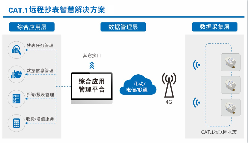 CAT.1物聯(lián)網(wǎng)水表是一款用于遠程抄表及制控的智能水表。它通過4G服務(wù)器進行遠程通訊,無需中間傳輸設(shè)備,簡化了設(shè)備安裝與布線工作,實現(xiàn)了水表自動遠程抄表,有效避免了管理部門上門抄表的人力工作,具備閥門控制功能,方便管理部門對水表使用情況進行控制。每個水表都作為一個終端獨立工作,維護簡單,工作運行可靠。結(jié)構(gòu)緊湊防護等級可達IP68,適用于各種環(huán)境無需調(diào)試,即裝即用,PC端和手機均支持,可滿足不同客戶管理需要,可設(shè)置告警用水 、透支水量等。水費計算滿足多種需求可細分為階梯、非階梯水價。廣泛應(yīng)用于中高端小區(qū)、別墅、學(xué)校、企業(yè)、工廠、公寓、水務(wù)等領(lǐng)域。