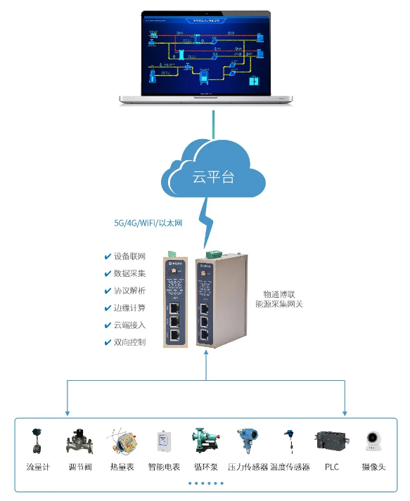 通過部署能源數(shù)采網(wǎng)關(guān),能夠?qū)崟r采集流量計、智能電表、熱量表、稱重儀器、循環(huán)泵、調(diào)節(jié)閥、溫度傳感器、壓力傳感器等設(shè)備,將供熱量、耗汽量、耗水量、耗電量、燃料消耗量、余熱利用量、溫度、壓力等數(shù)據(jù)對接到智慧供熱能源管理平臺中,從而將熱源、管網(wǎng)、中繼泵站、熱力站等納入統(tǒng)一的節(jié)能評價系統(tǒng)中,實現(xiàn)對能源的監(jiān)測、管理、統(tǒng)計與分析,助力提高能源利用效率與管理水平,實現(xiàn)節(jié)能、降本與增效的全面發(fā)展。