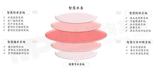 智慧水務(wù)系統(tǒng)由智慧給水、智慧排水、智慧防洪、智慧污水回用、智慧節(jié)水等五大子系統(tǒng)構(gòu)成,每個(gè)子系統(tǒng)下又包含水源監(jiān)控、水廠檢測(cè)、用戶超表等不同功能模塊。