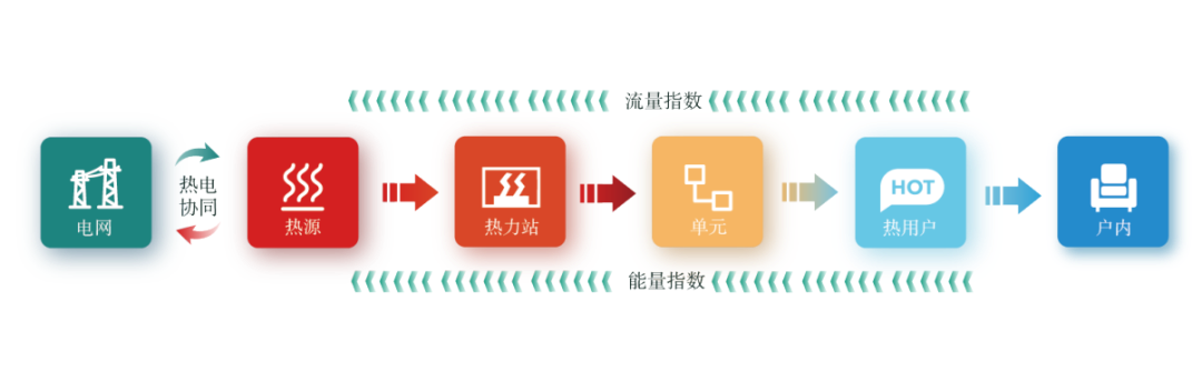 傳統(tǒng)的供熱系統(tǒng)是以“能源生產(chǎn)為導(dǎo)向”,熱源側(cè)保持供應(yīng)總量,用戶側(cè)分?jǐn)偟?ldquo;推動(dòng)式”供熱。新型“源-網(wǎng)-站-戶”全域協(xié)同的供熱模式是以“負(fù)荷需求為導(dǎo)向”,根據(jù)實(shí)際需求生產(chǎn)的熱量的“拉動(dòng)式”供熱。利用新一代信息化技術(shù),將水力平衡和熱力平衡的調(diào)控需求歸一為各個(gè)層級(jí)的標(biāo)準(zhǔn)流量指數(shù)和能量指數(shù),按“戶內(nèi)-熱用戶-單元-換熱站-熱源”的順序逐級(jí)依次向上傳遞,能量逐級(jí)向下精準(zhǔn)配送,進(jìn)而實(shí)現(xiàn)包括“熱電協(xié)同”在內(nèi)的“源-網(wǎng)-站-戶”全域協(xié)同。