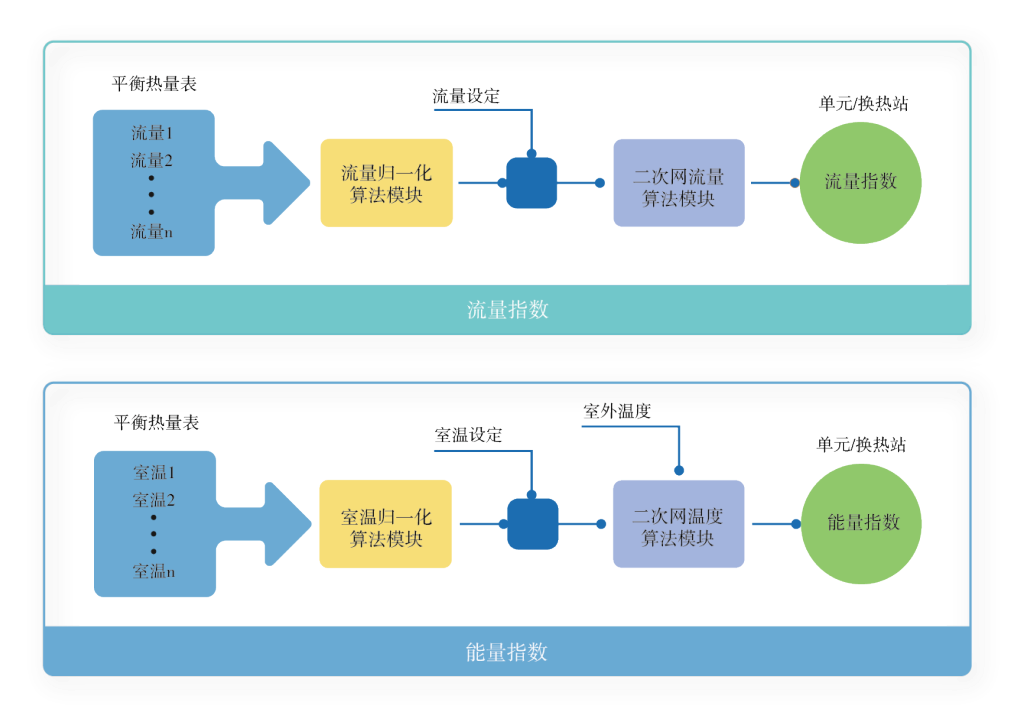 換熱站的流量指數(shù)由各熱用戶的流量加權(quán)平均而成,并進(jìn)行歸一化處理。流量指數(shù)作為二級(jí)網(wǎng)循環(huán)量閉環(huán)控制反饋信號(hào),實(shí)現(xiàn)水力的精準(zhǔn)調(diào)控,降低循環(huán)水泵電力消耗。采用具備室溫軟測(cè)量算法的平衡熱量表作為熱用戶的智控終端,能量指數(shù)由各熱用戶的室溫軟測(cè)量數(shù)據(jù)加權(quán)平均而成,并做歸一化處理。換熱站的能量指數(shù)進(jìn)一步向熱源端反饋熱量需求,標(biāo)準(zhǔn)化的能量指數(shù)使得熱源端能根據(jù)各個(gè)換熱站的能量需求情況統(tǒng)一分配熱能給各個(gè)換熱站,實(shí)現(xiàn)熱源的精準(zhǔn)調(diào)控。采用以能量指數(shù)為核心的熱能分配體系,熱源可以充分利用供熱系統(tǒng)的熱惰性最大限度地考慮電力系統(tǒng)的負(fù)荷特性,采取主動(dòng)削峰等技術(shù)手段,降低電力系統(tǒng)的容量投資。
